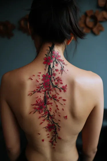 This tattoo features a striking line of cherry blossoms flowing gracefully down the spine. The blossoms are colored in vibrant shades of red with delicate black branches weaving through the design. Scattered petals drift outward, giving it a soft and natural movement that makes the entire piece look alive and dynamic. The placement along the spine enhances the elegance of the vertical flow, turning the back into a living canvas of floral beauty.