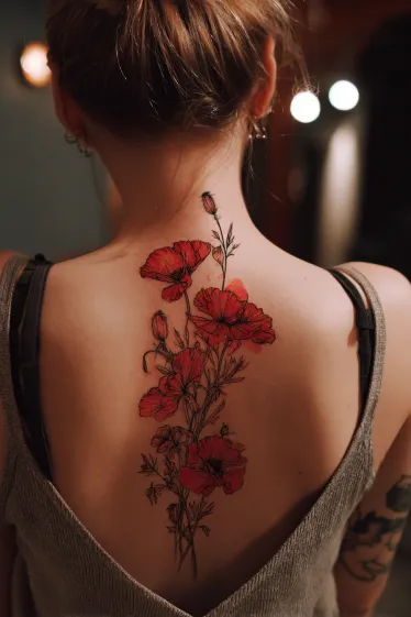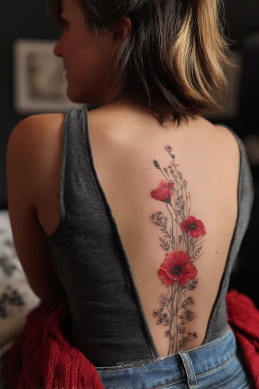 This tattoo features a cluster of red poppies arranged gracefully down the spine, accented with delicate stems and tiny buds. The flowers are shaded in vibrant reds with dark centers that make them pop, while the thin linework of the stems keeps the design light and elegant. The vertical placement enhances the natural length of the back, giving the tattoo a soft yet striking flow.
