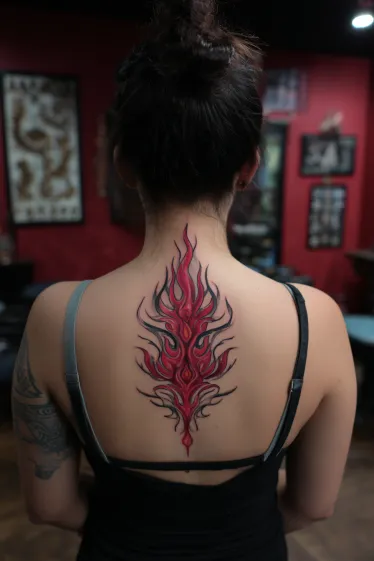 This tattoo showcases a fiery design that runs vertically along the spine, shaped like rising flames. The bold red ink is layered with darker accents that add depth and movement, while the pointed tips create a striking upward flow. The placement keeps the design centered, making it look balanced and powerful on the back.