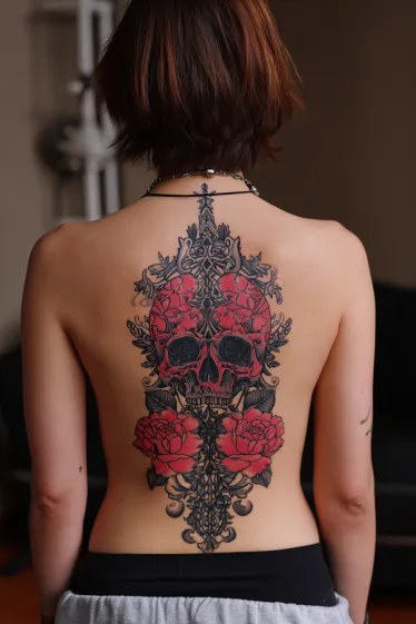 This tattoo stretches down the spine with an intricate mix of ornamental detailing, a bold skull centerpiece, and vibrant red roses. The skull is shaded in dark tones while the roses stand out with rich red petals that soften the overall look. The ornamental flourishes frame the entire piece, giving it a balanced and decorative structure that feels both edgy and elegant.