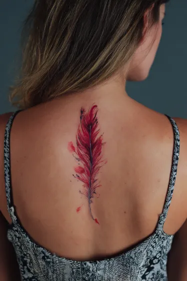 This tattoo features a single feather placed vertically along the spine, designed in a watercolor style. The feather is colored in deep reds with touches of darker shading, giving it a soft textured look. The edges appear slightly blurred, almost like brushstrokes, which makes the tattoo feel artistic and free-spirited. The placement right down the spine adds a natural symmetry that draws the eye instantly.