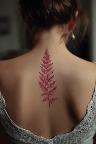 This tattoo features a delicate red fern running vertically along the spine. The design is made up of fine lines that capture each tiny leaflet, giving it a realistic and graceful look. Its slim shape naturally follows the curve of the back, making it appear both simple and sophisticated at the same time.