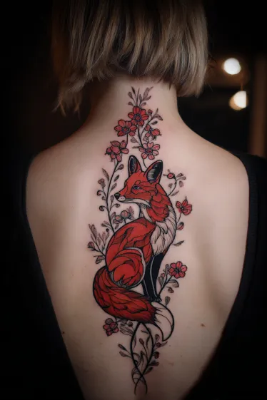 This tattoo features a beautifully detailed red fox sitting gracefully along the spine, surrounded by delicate red blossoms and fine leafy branches. The fox is shaded with bold reds and subtle highlights, giving its fur a soft yet vivid look, while the flowers add a touch of femininity and balance to the design. The placement makes the fox appear almost intertwined with the natural curve of the back, creating a flowing, elegant composition.