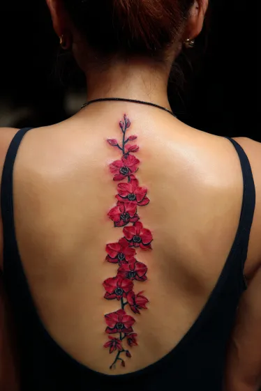 This tattoo displays a line of orchids flowing down the spine, each blossom detailed in rich shades of red. The petals are softly shaded with black accents, while the thin vines connect the flowers, creating a graceful vertical design. The placement makes the orchids look as though they are naturally growing along the spine, giving the tattoo a balanced and elegant appearance.