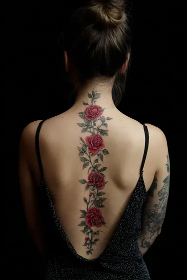 This tattoo shows a line of blooming red roses flowing down the spine, connected by delicate stems and shaded leaves. Each rose is drawn with depth and detail, the petals highlighted in rich reds that stand out against the darker greens of the leaves. The vertical design mirrors the natural shape of the spine, creating a graceful and balanced look that feels timeless.