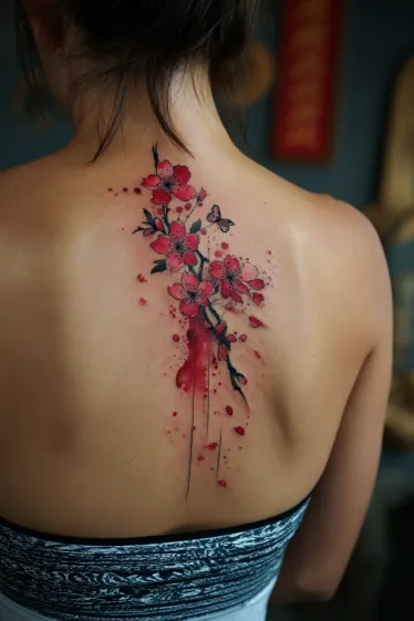 This tattoo features a cluster of cherry blossoms cascading down the spine, created with a blend of sharp details and soft watercolor effects. The blossoms are shaded in vibrant red, with dark branches and splashes of paint-like ink that give it a dynamic and artistic feel. The scattered petals add movement, while the watercolor drips make the design look like a living piece of art.