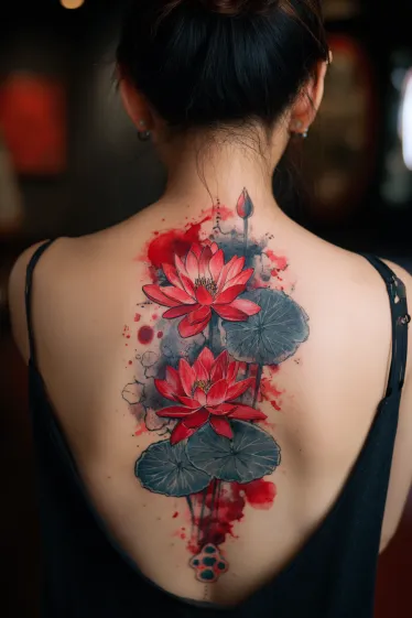 I think this tattoo is absolutely gorgeous because it combines symbolism with creativity. The lotus is often seen as a symbol of resilience and spiritual growth, and here it looks powerful yet feminine. To me, the mix of vivid red and watercolor splashes makes it feel alive, like a painting brought to life on the skin.
