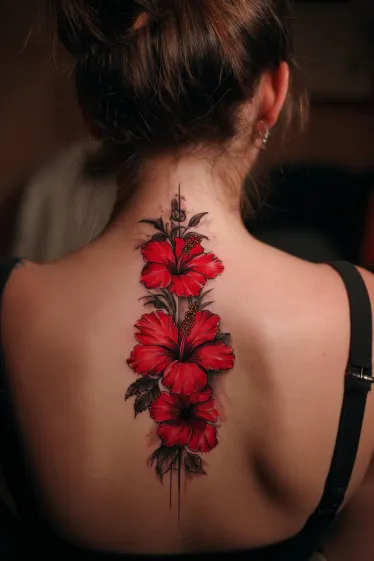 This tattoo showcases a vertical row of bold red hibiscus flowers flowing down the spine. Each blossom is detailed with layered petals in deep shades of red, while the dark leaves and stems add striking contrast. The design is perfectly aligned with the spine, making the flowers look as though they’re blooming upward along the natural curve of the back.