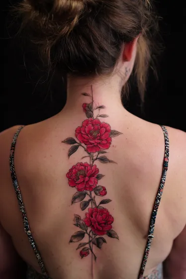 This tattoo features a graceful line of red camellia flowers arranged vertically along the spine. The blossoms are shaded with deep, layered petals in bold red, while the leaves are done in darker tones to add contrast and balance. The placement follows the natural curve of the back, giving the design an elegant flow that feels soft yet striking.