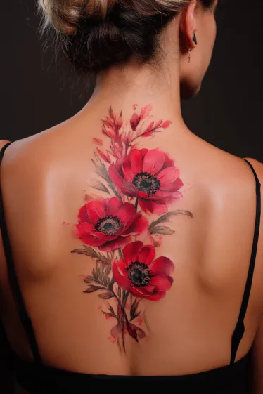 This tattoo showcases large red anemone flowers blooming along the spine, shaded with dark centers that create a dramatic contrast. The petals are highlighted with soft gradients, while the leaves and stems weave naturally through the design. A watercolor effect surrounds the flowers, adding splashes of color that give the tattoo a painterly and artistic look.