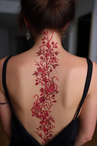 Red Botanical Vine Spine Tattoo