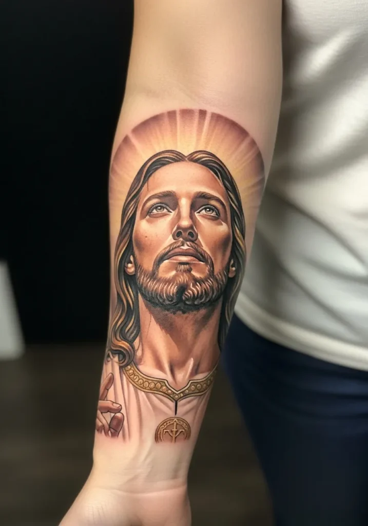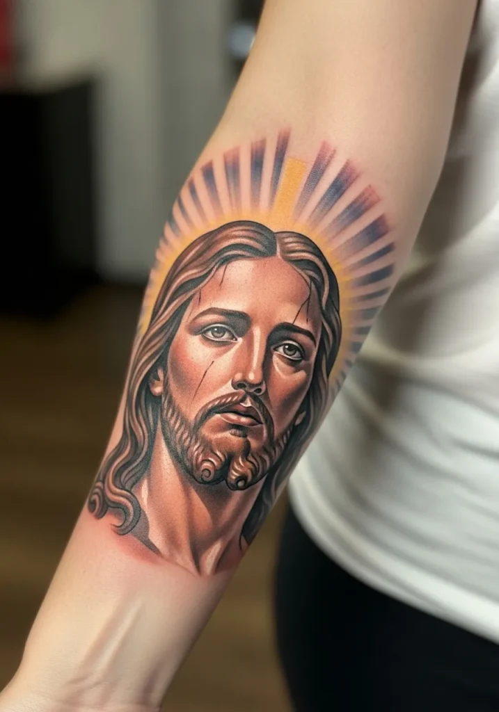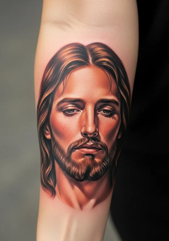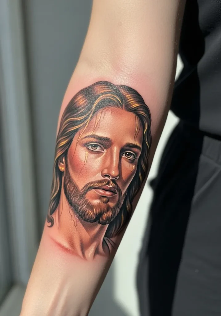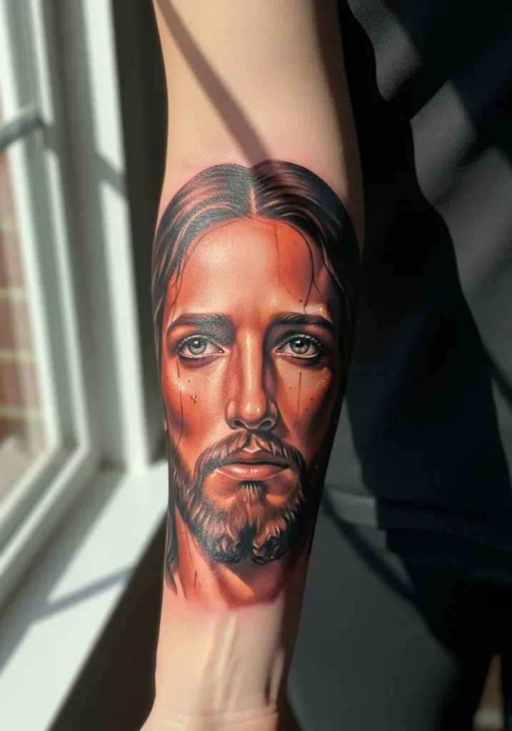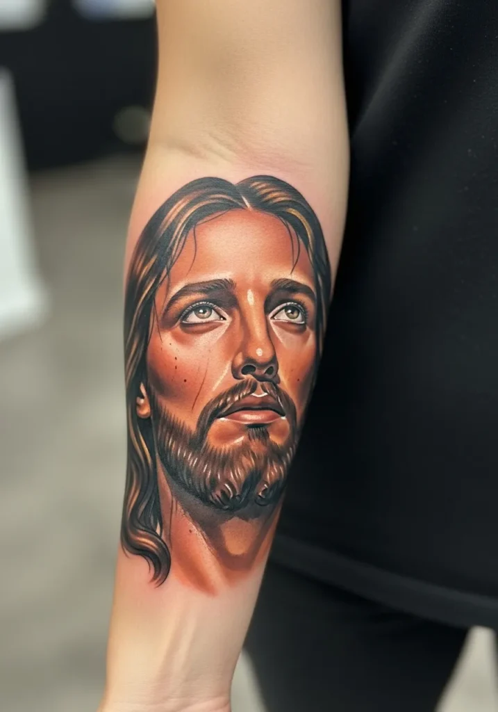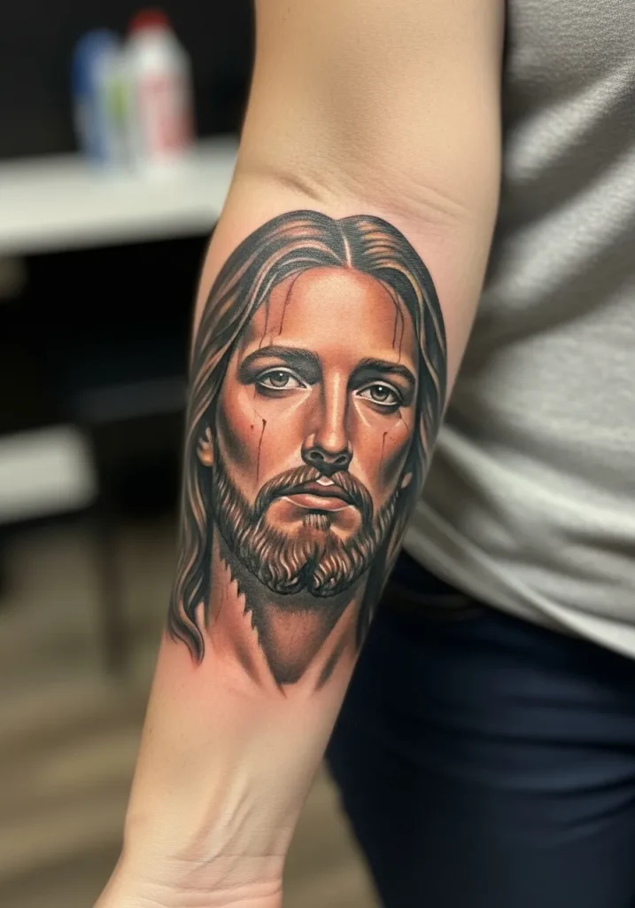 This forearm tattoo places a Christ portrait in natural light, using warm highlights and smooth realism shading to enhance depth.