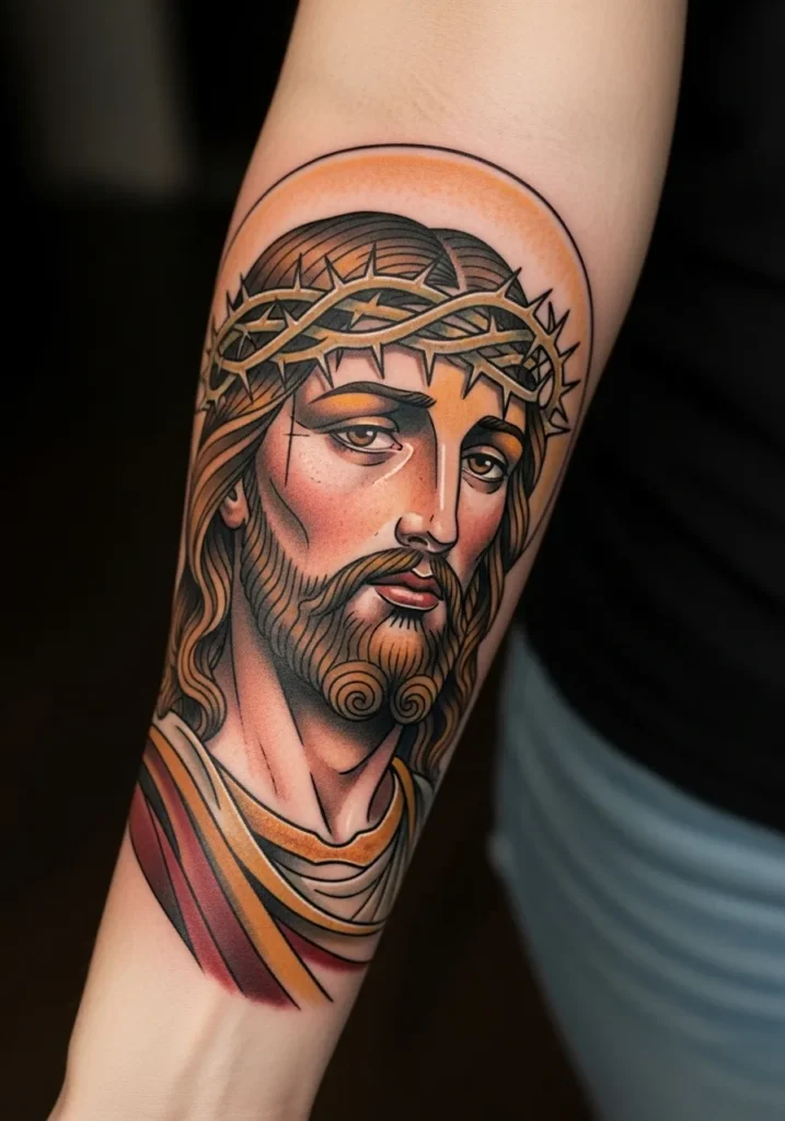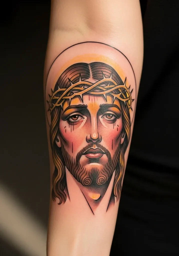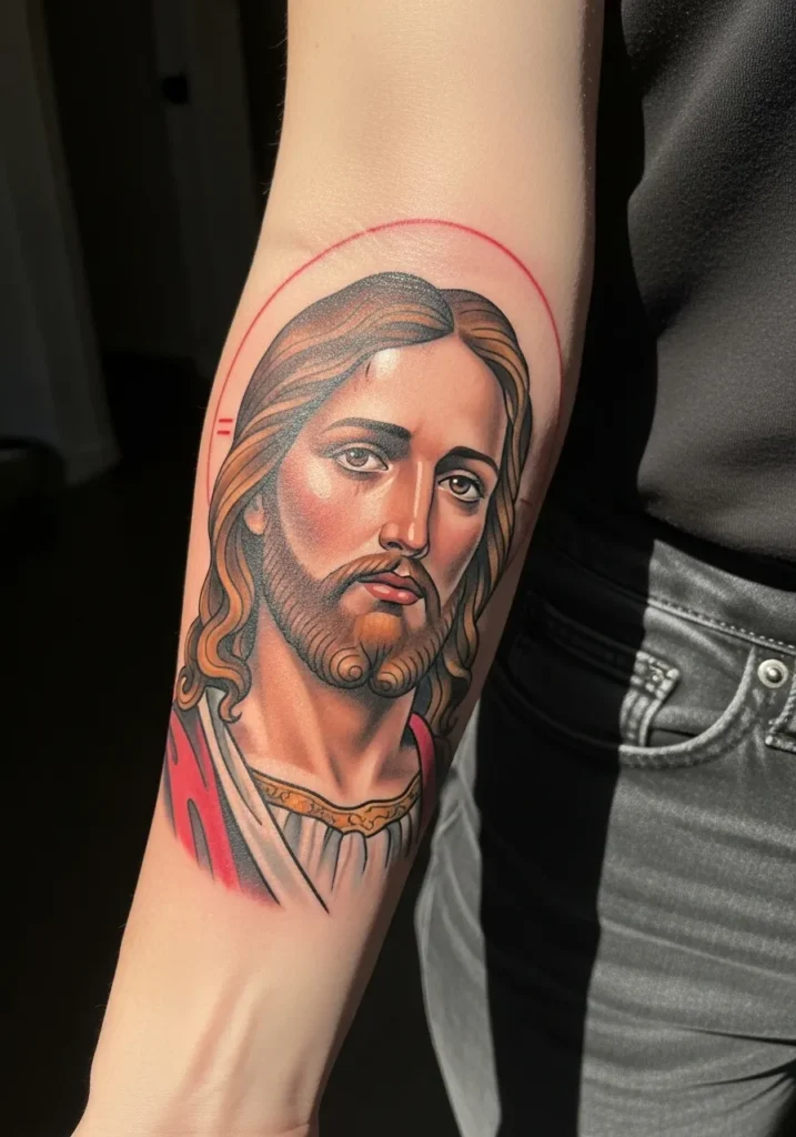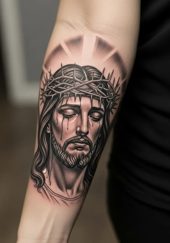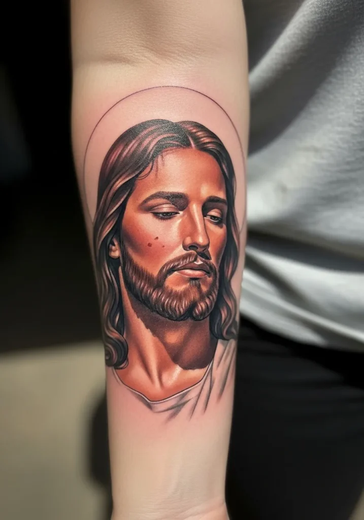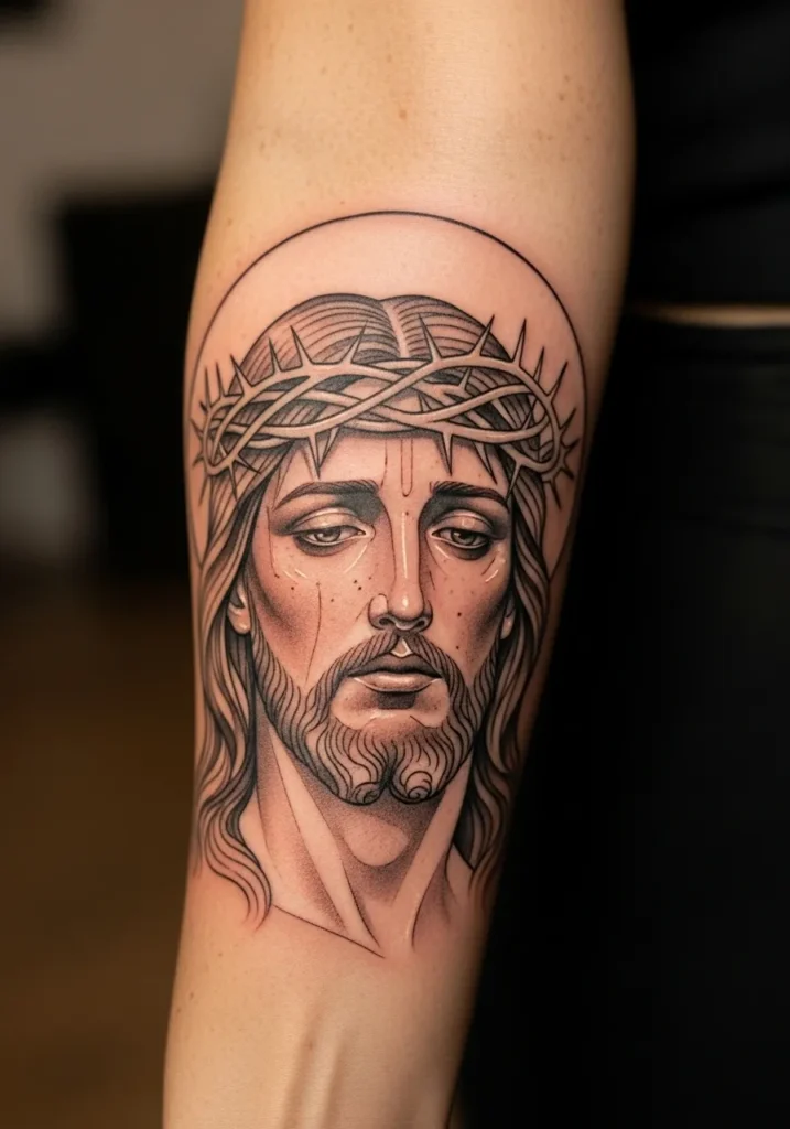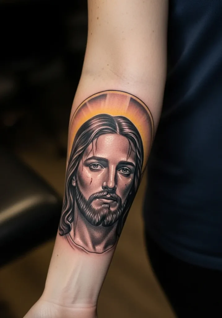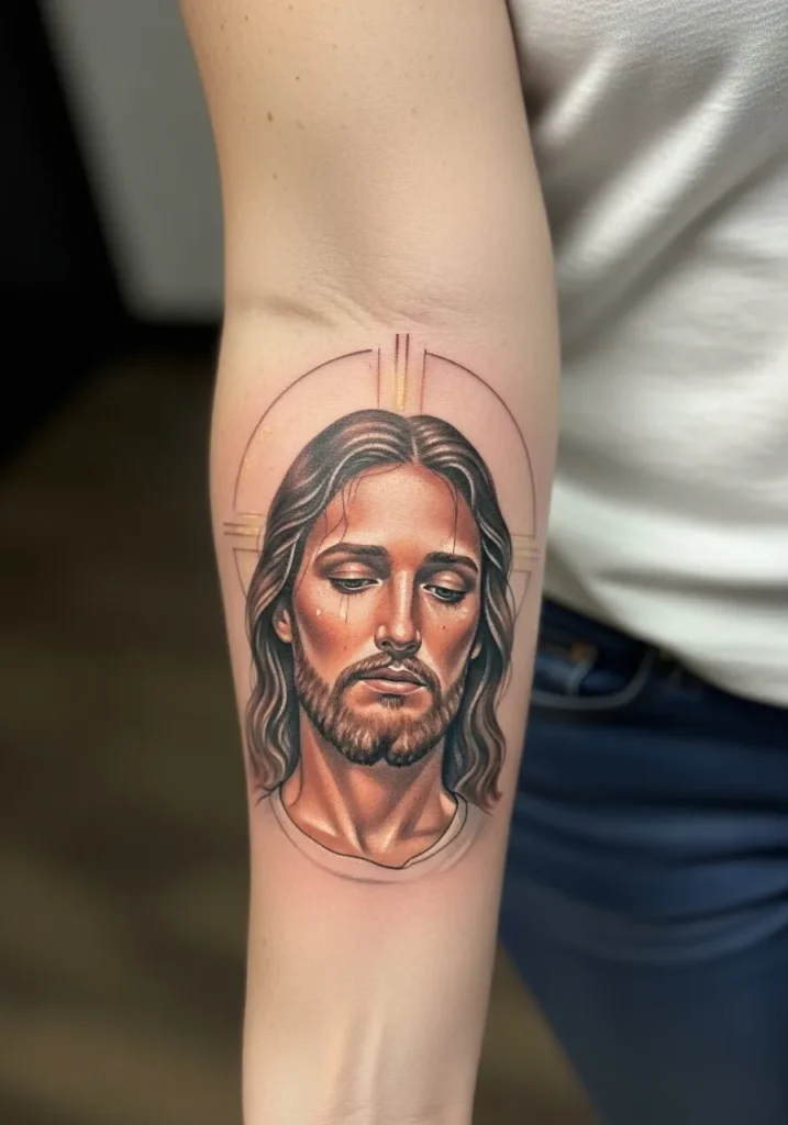 This forearm tattoo features a detailed Christ portrait framed by a thin halo outline that adds structure without stealing focus.