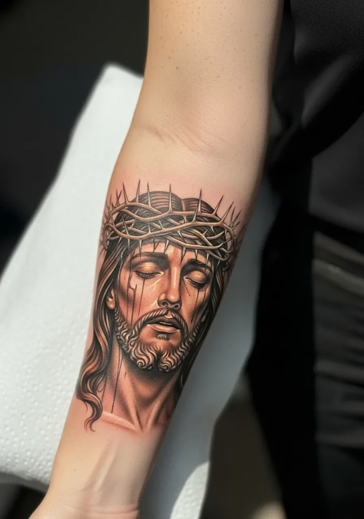 This refined forearm piece shows Christ wearing the crown of thorns, rendered in detailed realism with warm browns and softened shadows.