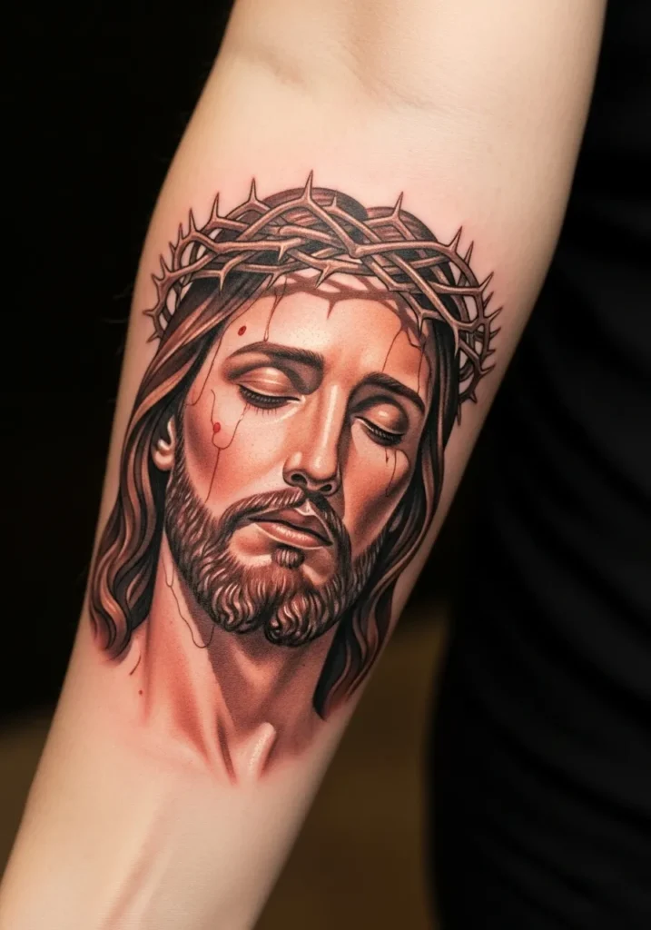 This forearm tattoo showcases Christ wearing a detailed crown of thorns, rendered in refined realism with careful linework and warm earthy colors.