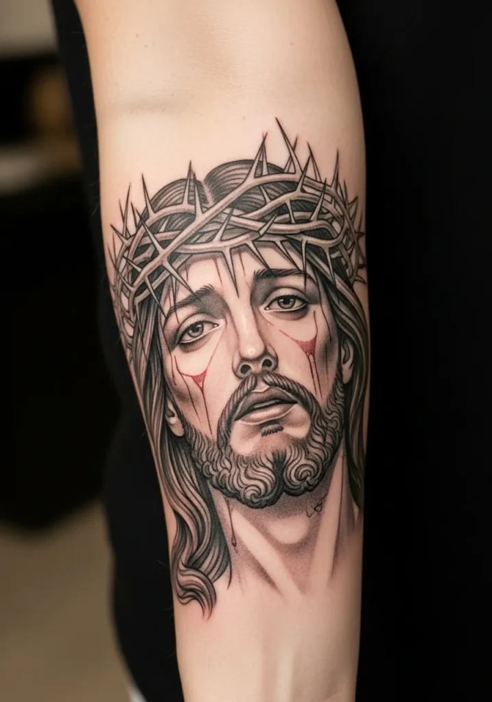 This refined Christ tattoo is placed along the inner forearm, sized to keep the face as the clear focal point without overpowering the arm.