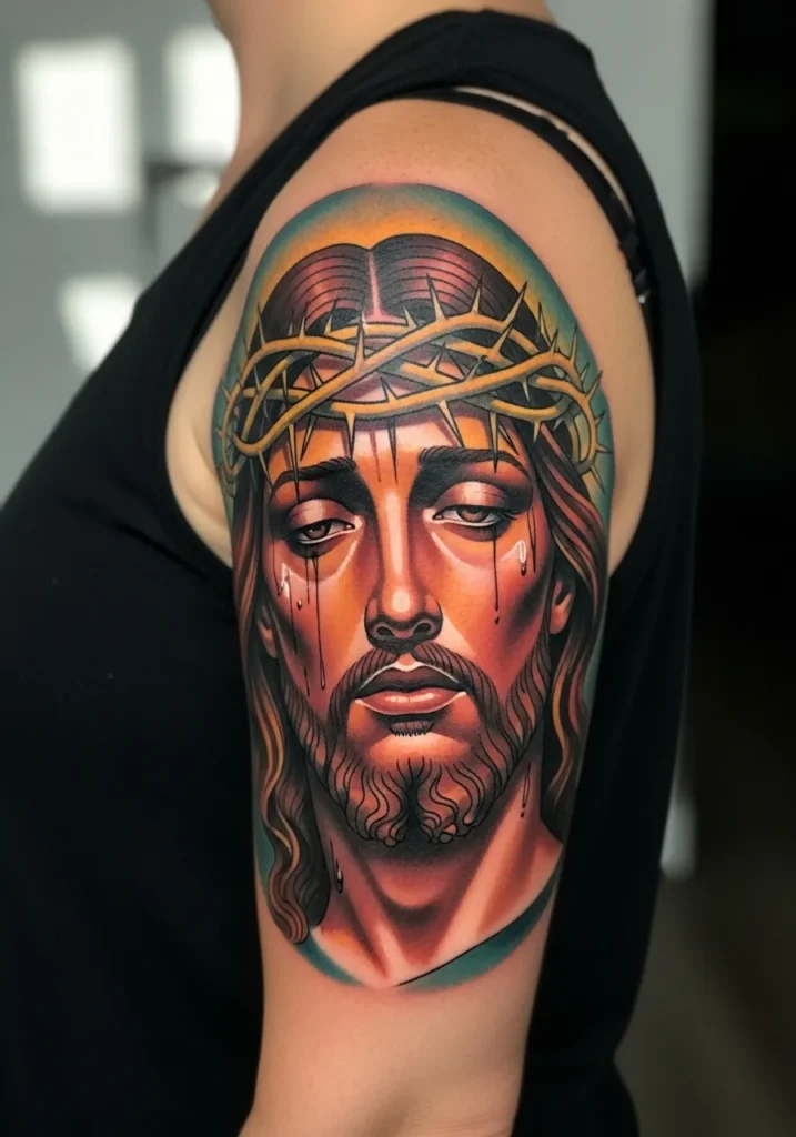 Placed on the upper arm, this smaller tattoo features a simplified Christ portrait with clean lines and soft color accents. The shading is light, keeping the overall look airy and approachable. It feels easy to wear and beautifully balanced.