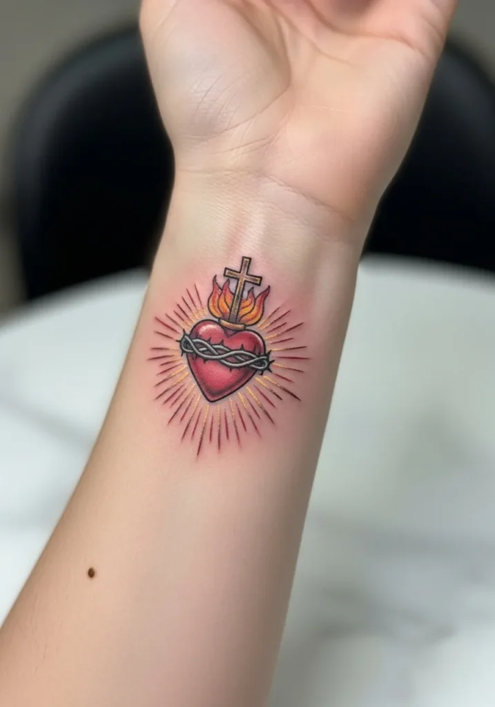 This smaller tattoo rests on the inner wrist and features a sacred heart symbol with Christ inspired elements. Reds, golds, and soft shading give it a glowing effect while keeping the size delicate. The placement makes it subtle yet meaningful.
