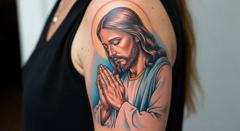 Placed on the upper arm, this medium sized tattoo shows Christ with hands folded in prayer. The colors are rich but soft, with blues and warm skin tones creating a peaceful mood. The composition feels classic and respectful, fitting naturally with the arm shape.