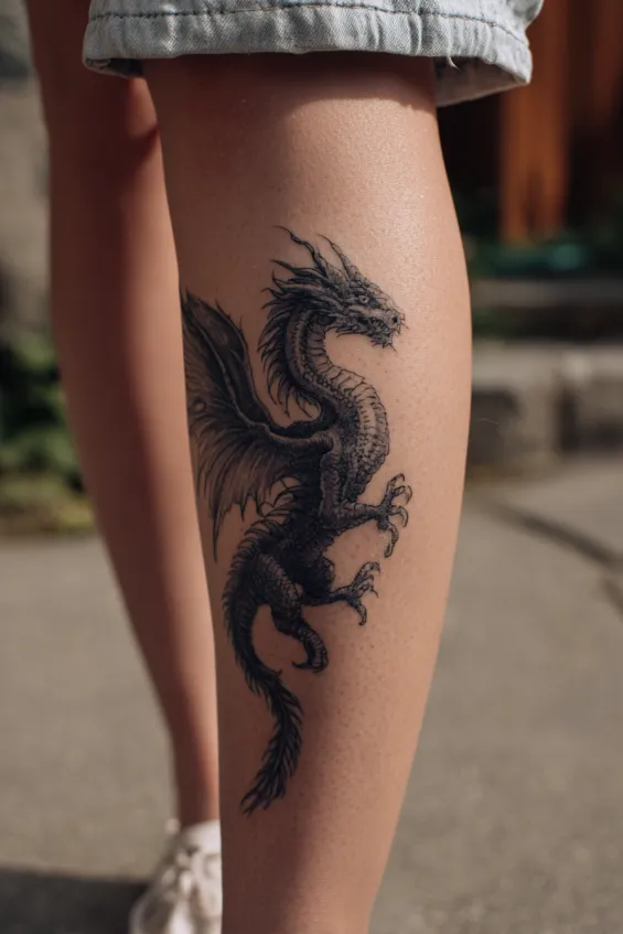 This bold blackwork dragon stretches vertically along a woman’s calf, its wings slightly open and claws extended in a poised stance. The design is medium to large in size, with dense black shading and detailed scale work that creates a dramatic silhouette against her skin. The elongated body follows the natural line of the lower leg, making the placement feel balanced and sculpted. Every curve of the dragon enhances the shape of her calf, giving the tattoo a powerful yet refined presence.