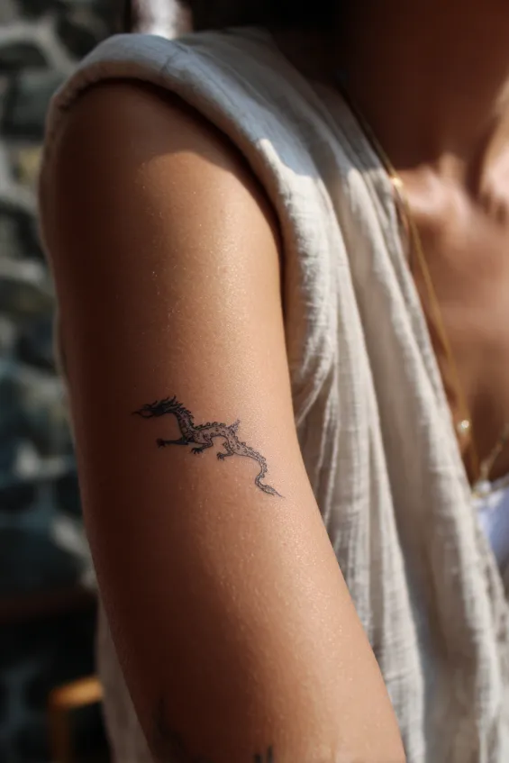 This petite fine line dragon rests gently on a woman’s upper arm, designed in a slim, minimalist style. The lines are thin and precise, with subtle detailing along the spine and tail that keeps the dragon looking graceful rather than heavy. Its small size makes it understated, while the placement on the outer arm gives it just enough visibility to feel intentional. The overall look is clean, airy, and beautifully refined.