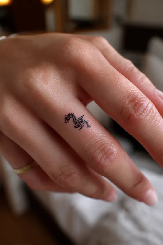 This ultra delicate dragon is inked along the side of a woman’s finger, designed almost like a subtle ring. The fine line work is incredibly precise, forming a miniature dragon with a softly curved body and minimal shading. Its small size keeps it discreet, while the placement on the finger makes it feel intentional and fashion forward.