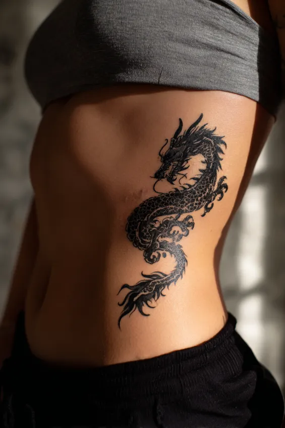 This elongated black dragon runs vertically along a woman’s ribcage, following the natural contour of her waist. The linework is bold yet refined, with elegant curves and subtle shading that give it movement without overwhelming the skin. The size is medium to large, making it striking but still sleek.
