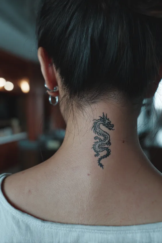 I think nape tattoos are so effortlessly elegant. When her hair is up, it feels bold and intentional. When her hair is down, it becomes a hidden detail. That versatility makes this refined dragon feel extra special.