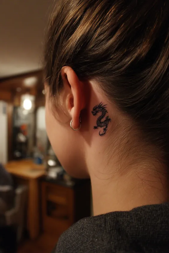 This small fine line dragon sits just behind a woman’s ear, delicately curved to follow the natural shape of her hairline. The lines are thin and precise, forming a tiny coiled dragon with subtle shading that keeps it soft and feminine. It is a minimal design, likely small in size, but it makes a surprisingly refined impact.