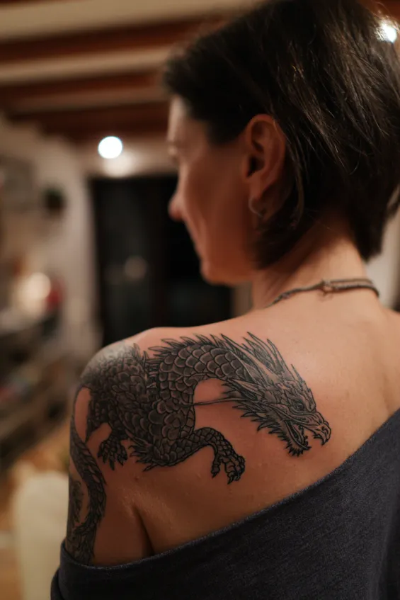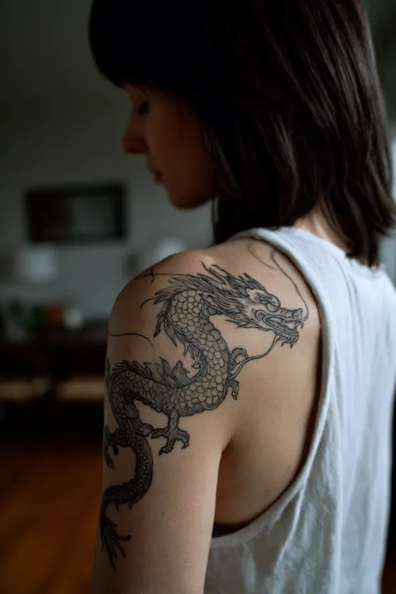 I love how this placement makes the design look powerful without being overwhelming. It feels balanced and intentional, like the dragon was meant to guard her shoulder. It is bold, feminine, and beautifully refined all at once.