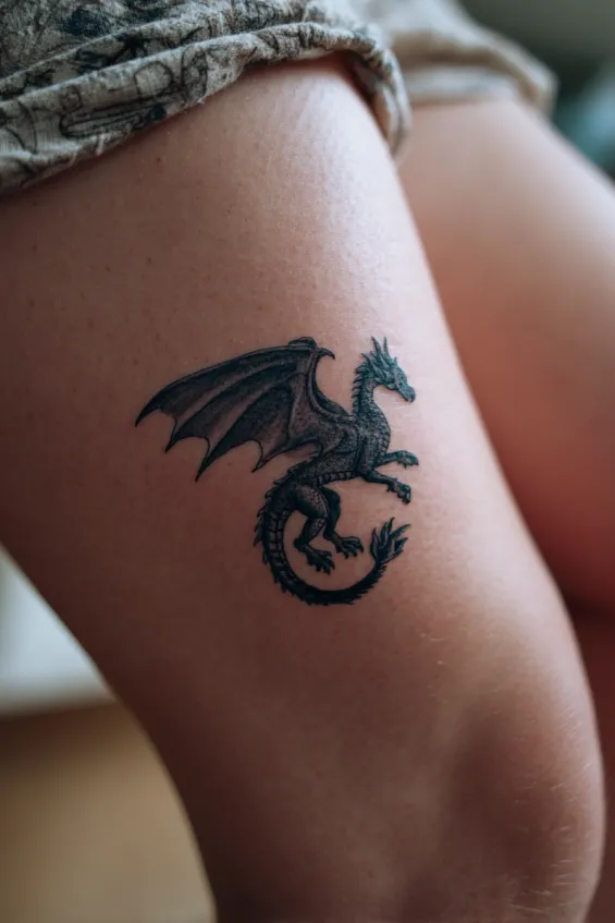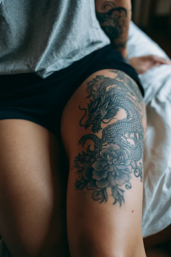 This medium to large dragon rests along a woman’s upper thigh, curving with the natural shape of her leg. The design blends black and grey shading with delicate ornamental elements that soften the overall look. The scales and tail flow downward in a way that elongates the leg beautifully.