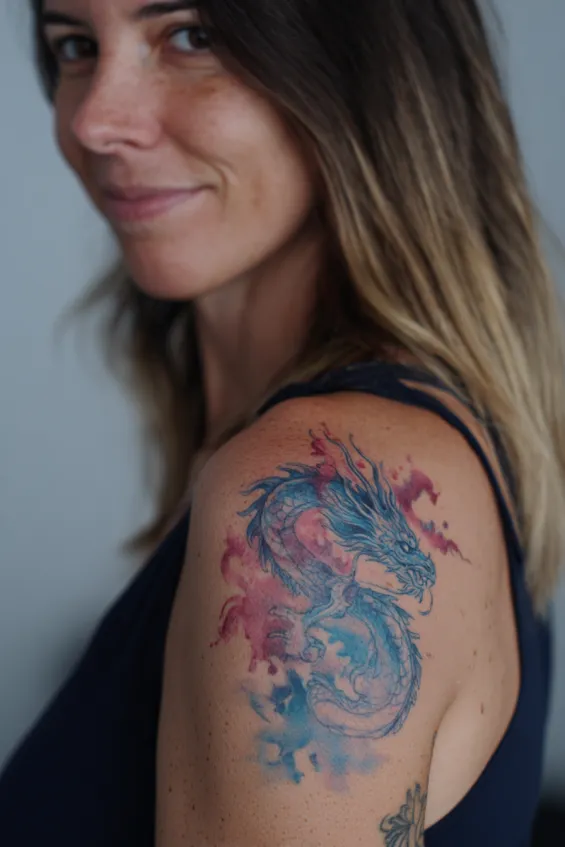 This medium sized dragon blooms across a woman’s upper shoulder in soft watercolor tones of blue, pink, and hints of purple. The edges look gently blended, almost painterly, while a fine outline keeps the dragon shape crisp and refined. The placement allows the design to move naturally with the shoulder, giving it a graceful flow.