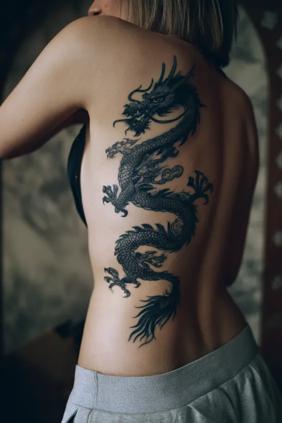 This large dragon spreads across a woman’s back, its body twisting in a dramatic yet elegant composition. The scales are densely shaded, and the head is detailed with sharp features and flowing whiskers. Even though it is bold and sizable, the artistry keeps it polished and intentional rather than chaotic.