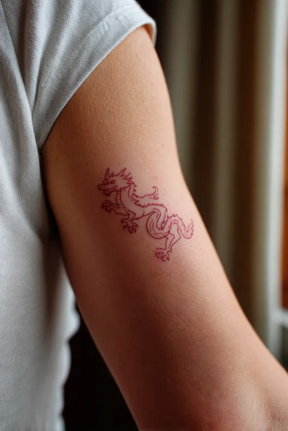 This small red dragon is inked along a woman’s upper arm in a delicate fine line style. The lines are thin and airy, creating a lightweight silhouette rather than a heavily shaded figure. The red ink gives it a subtle pop while still keeping the design clean and sophisticated.