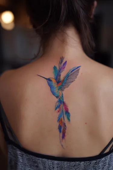 This tattoo shows a beautifully detailed hummingbird placed along the spine, its wings spread as if caught mid-flight. The colors are bright and painterly, blending vivid blues, purples, oranges, and pinks in a soft watercolor effect. The feathers trail gracefully downward, elongating the spine and adding movement to the design. The mix of bold outlines and blended shades makes it feel both delicate and striking at the same time.