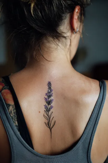 This tattoo shows a single lavender sprig placed neatly along the spine, drawn with fine lines and soft shading. The purple blossoms are delicate and realistic, while the green stems and leaves add a natural touch that feels fresh and calming. The slim, vertical shape fits perfectly with the flow of the spine, creating a design that feels simple yet elegant.