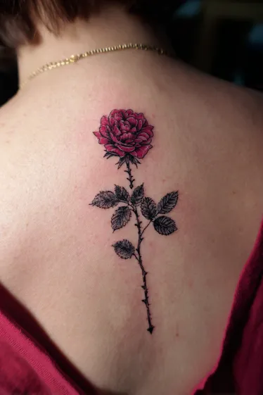 This tattoo features a single rose placed elegantly along the spine, with a deep red bloom at the top and a thorny stem extending downward. The petals are shaded to show depth and softness, while the leaves are detailed with fine lines that add texture and contrast. The vertical flow makes it a natural fit for the spine, and the combination of color and black ink creates a striking balance.