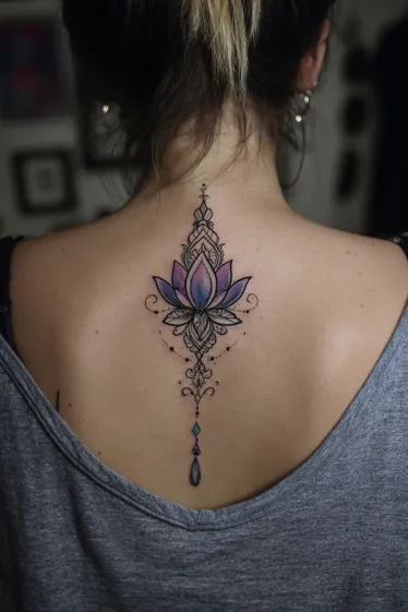 This tattoo highlights a lotus flower opening gracefully along the spine, with soft purple and blue tones blending through its petals. The flower sits at the center of an ornate mandala-style design that extends both upward and downward, adding delicate symmetry and detail. Tiny dots and ornamental flourishes frame the lotus, while a jewel-like drop at the bottom completes the elegant vertical flow.