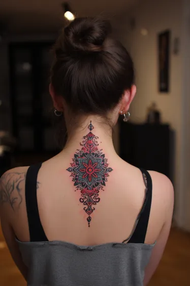 This tattoo showcases an ornate mandala design running along the spine, with layers of petals and geometric shapes arranged in perfect symmetry. The bold use of red and black gives it a dramatic edge, while small ornamental details extend vertically to enhance the flow of the spine. The combination of sharp outlines and soft shading makes the whole design look balanced and polished.