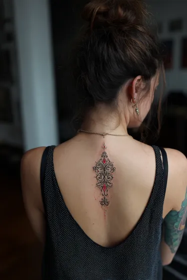 This tattoo is a delicate ornamental design that runs gracefully down the spine. The pattern is symmetrical with flowing curves and tiny flourishes, highlighted with subtle touches of red that bring a soft vibrance to the black linework. Its vertical placement emphasizes the natural shape of the back, giving it a refined and balanced look that feels timeless.