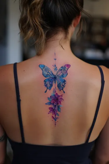 This tattoo combines a watercolor butterfly with flowers arranged gracefully down the spine. The butterfly at the top spreads its wings in vibrant shades of blue and purple, while the flowers beneath it carry matching tones that flow beautifully together. The watercolor style softens the edges, giving the whole design a dreamy and artistic feel that looks like it was painted directly onto the skin.