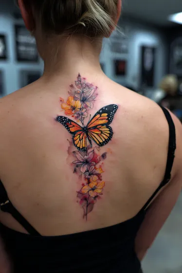 This tattoo features a monarch butterfly in vivid orange and black resting along the spine, with delicate flowers trailing above and below it. The wings are detailed with crisp lines and white accents that make the butterfly look almost lifelike. Soft watercolor splashes in shades of pink, purple, and yellow surround the flowers, adding movement and depth to the design.