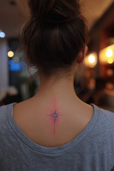 This tattoo is a radiant starburst placed neatly at the top of the spine. The design uses thin, precise lines in shades of pink and blue that cross outward, creating a glowing effect that feels both minimal and striking. The colored lines blend softly at the center, making the star look almost like it’s shining from within.