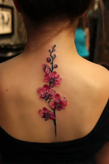 This tattoo shows a graceful orchid branch flowing down the spine, with blossoms in soft shades of pink and purple. The petals are shaded beautifully, giving them a lifelike, velvety texture, while the dark stem and buds create contrast and balance. Its vertical design follows the spine naturally, making it look elegant and refined without feeling overly bold.