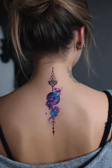 This tattoo places a dreamy galaxy design along the spine, with swirling purples, blues, and pinks blending together in a watercolor effect. At the center is a glowing planet, surrounded by cosmic details that make it feel like a tiny piece of the universe has been inked onto the skin. Black ornamental accents frame the galaxy, adding symmetry and structure to the fluid colors.