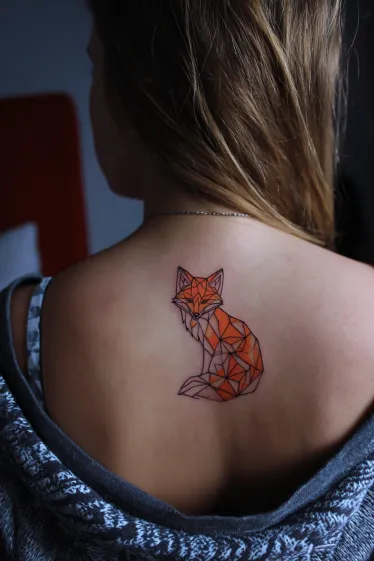 This tattoo features a fox designed in a geometric style, with sharp angular shapes filled in shades of orange and red. The fox sits gracefully at the upper spine, its face tilted slightly to the side, giving the piece both structure and personality. The clean black outlines paired with the bold color blocks make it modern and striking, yet still delicate enough to feel feminine.