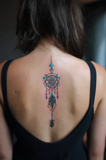 I find this tattoo so charming because it blends meaning with style. Dreamcatchers are often seen as symbols of protection and positivity, and having one placed along the spine makes it feel both personal and powerful. I love how the little touches of color keep it playful while still looking graceful and timeless.