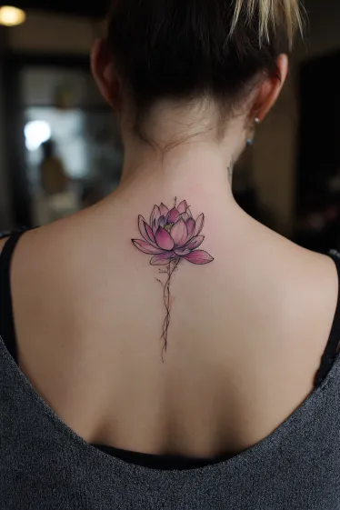 This tattoo shows a single lotus flower at the top of the spine, with soft pink petals fading into hints of purple. The stem extends downward in a fine, delicate line, giving the design a graceful vertical flow without overwhelming the back. The shading is gentle, making the flower look almost three-dimensional, as if it’s blooming right on the skin.