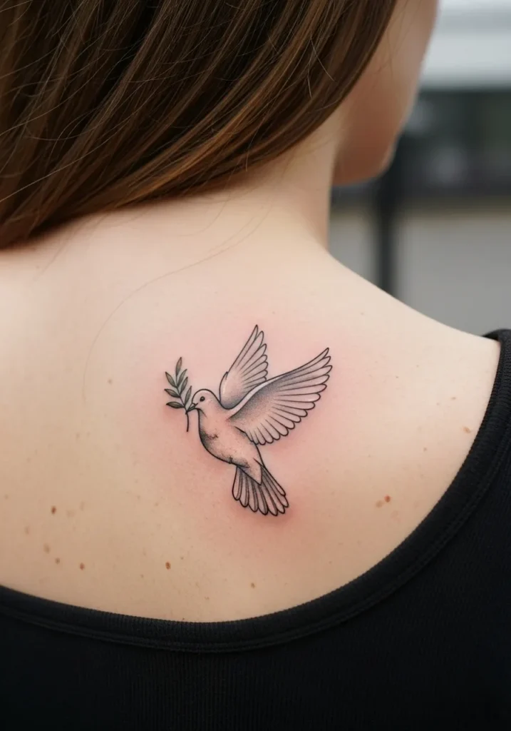 This tattoo shows a small dove placed on the upper back near the shoulder blade.