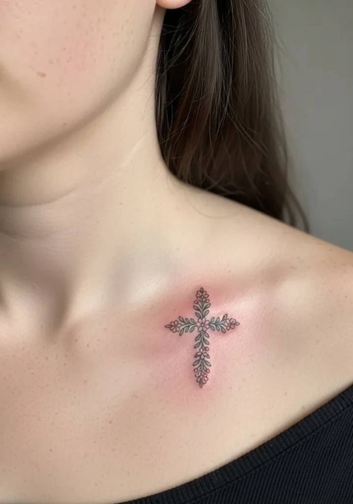 This design shows a small cross formed with subtle floral details placed just below the collarbone.
